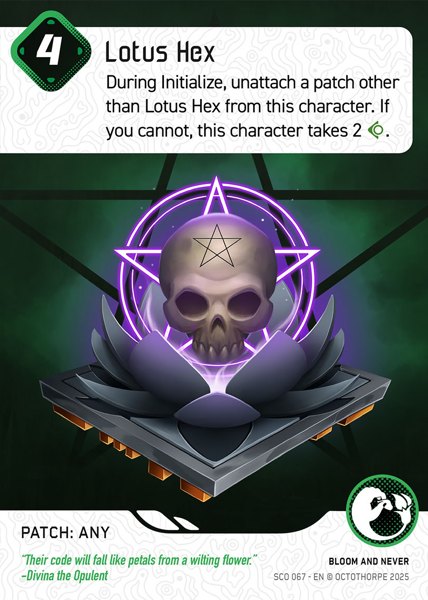 During Initialize, unattach a patch other than Lotus Hex from this character. If you can not, this character takes 2 [corruptionDamage].