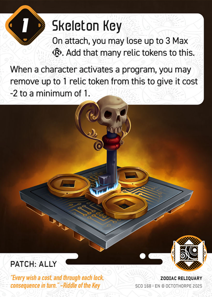 When a character activates a program, you may remove up to 1 relic token from this to give it cost -2 to a minimum of 1.