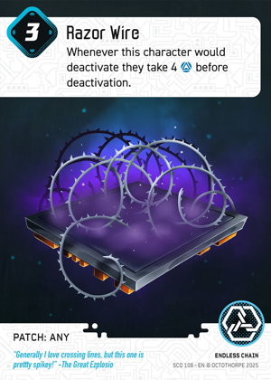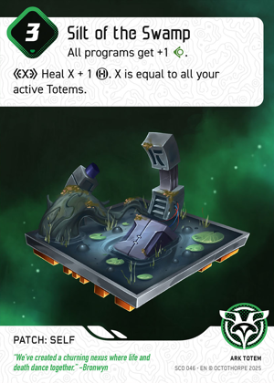 Turn 3: Often you will just play Deadly Transmission and Shining Moon Netsuke this turn, but there are a few other options. You could use a key charge to play the Razor Wire early onto someone who may want to swap out early to try and discourage it, then still play the Deadly Transmission. You can also turbo out the Silt of the Swamp by playing Shining Moon and using the key charge, although this wastes a RAM. Remember that during update, you have the option to (after taking the Implement damage to get a relic), put it on the Shining Moon and immediately use it to remove an enemy patch if need be.