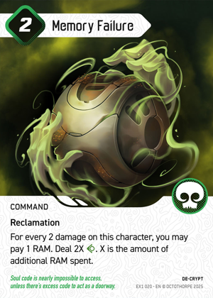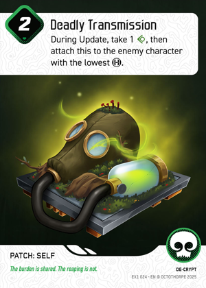 Bronwyn's use is fairly obvious here (if you read the turn by turn lol) - sets up Yama with the undead patch, gets a good source of one sided damage going then makes Memory Failure available for Yama to use a ton. Deadly transmission will bounce between the opponent and Yama, but Yama will be undead so the damage only matters for them.